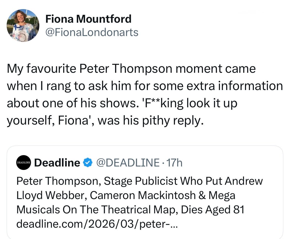 Thompson, the quintessential old-school West End publicist, has died at 81. Thompson, whose career spanned more than four decades, preferred the analog approach: he never typed, instead dictating to an assistant, and cherished personal connections—telephone calls, lunches, and post-show drinks with clients and journalists.