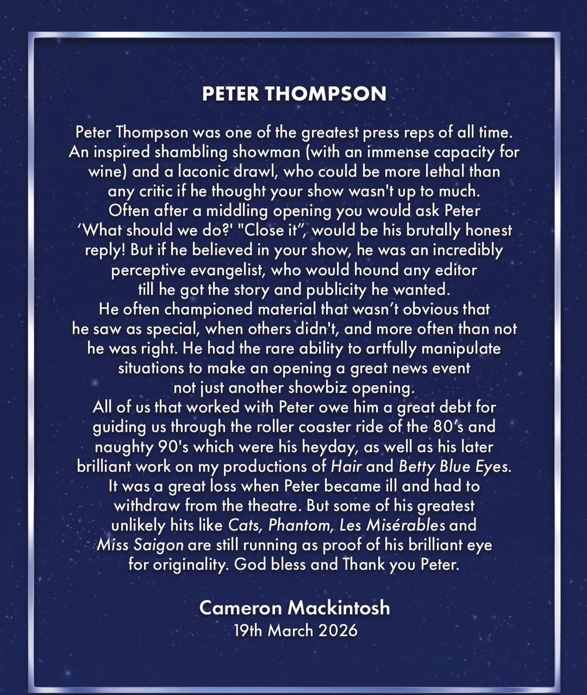 He orchestrated publicity for some of the biggest stage hits of his time, including Andrew Lloyd Webber’s Cats and The Phantom of the Opera, as well as launching Cameron Mackintosh’s Les Misérables and Miss Saigon. Thompson’s influence extended far beyond press releases. You knew where you stood.